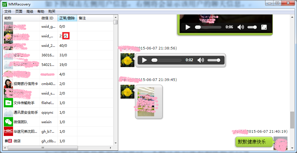 支持微信信息的查看(图片、语音、视频)、打印、保存及删除记录恢复功能
